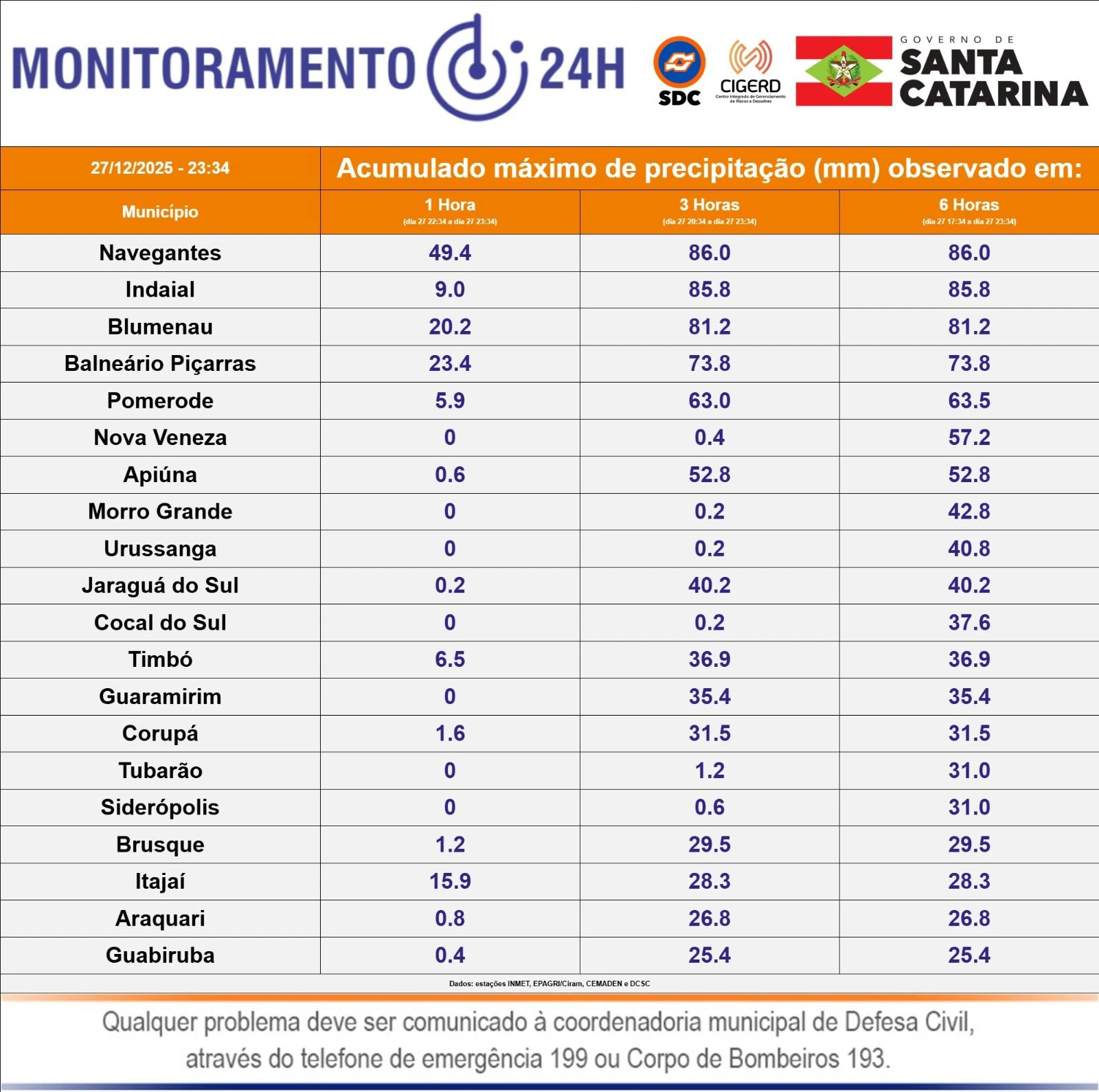De acordo com o levantamento, no Sul de Santa Catarina, a cidade de Nova Veneza liderou o volume de precipitação, com 57,2 milímetros. Em seguida aparecem Urussanga, com 40,8 mm, Cocal do Sul, que acumulou 37,6 mm, além de Tubarão e Siderópolis, ambas com 31 mm de chuva registrada entre 17h34 e 23h34.